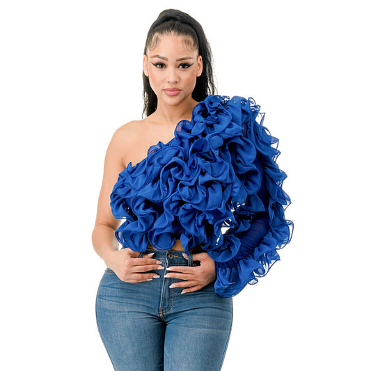One Shoulder Long Sleeve Ruffle Detail Crop Top