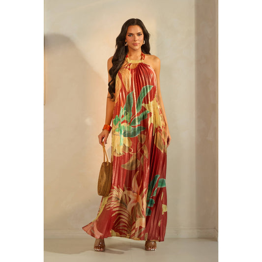 PLEATED FLORAL PRINT HALTER MAXI DRESS