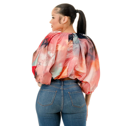 Balloon Short Sleeve Front Zip Bubble Cropped Top