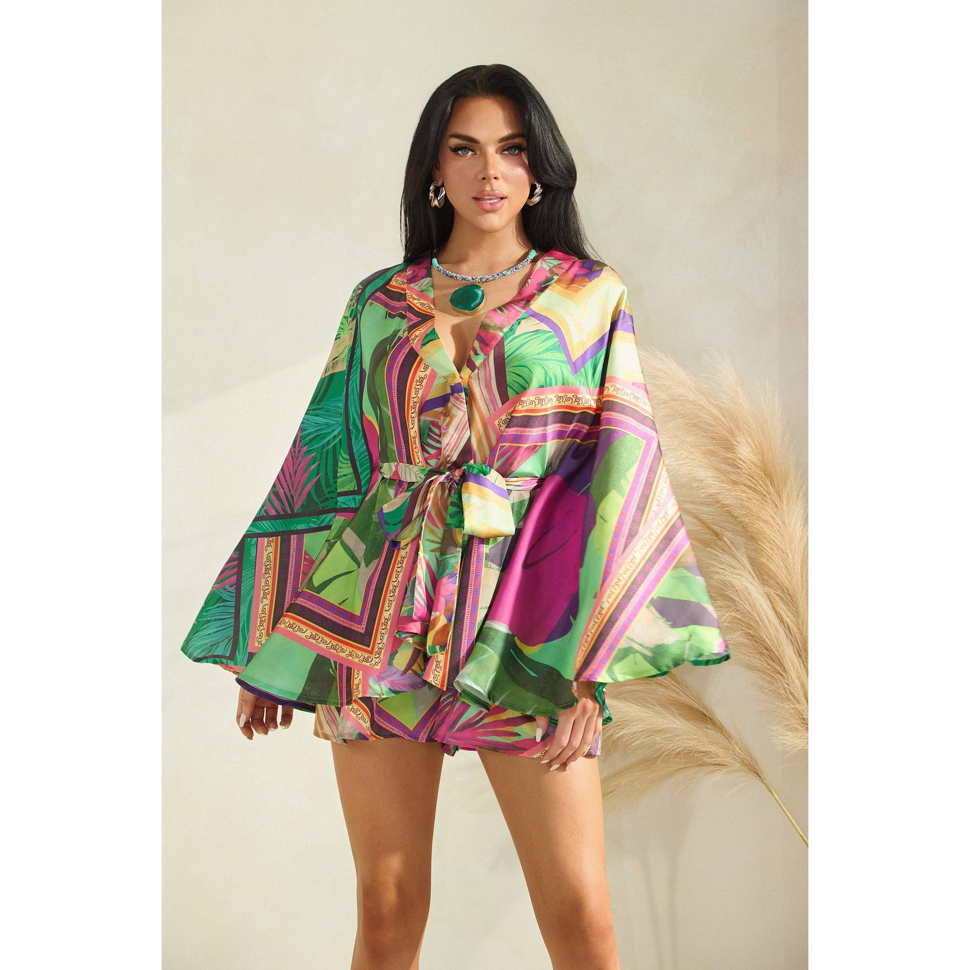 TROPICAL PRINT KIMONO TOP WITH SHORTS SET